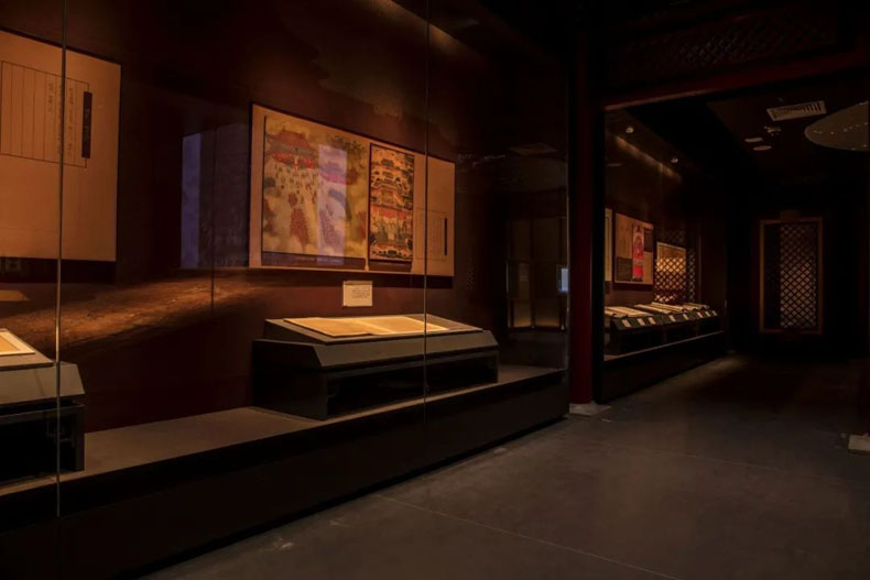 在空间中,涉及宫廷部分,采用皇家建筑中的一些元素,如:文渊阁书柜、窗格、顶部凿井、匾额等贯穿展览空间,使得每个区域即独立又富有联系。通过顶部和地面营造基础色调,皇家颜色贯穿整个展览,保障各个部分整体协调统一。每个部分颜色区分通过小面积的标题版以及展板进行区分,使得空间既协调又有区分。