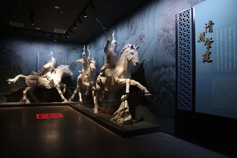 由于建筑结构将展览划分为两个区域,在清朝展区前增设一个小序厅作为过渡空间,于白山黑水背景中,凸显弓马骑射雕塑的视觉张力,并在内容层面衔接第二部分清朝肇建。